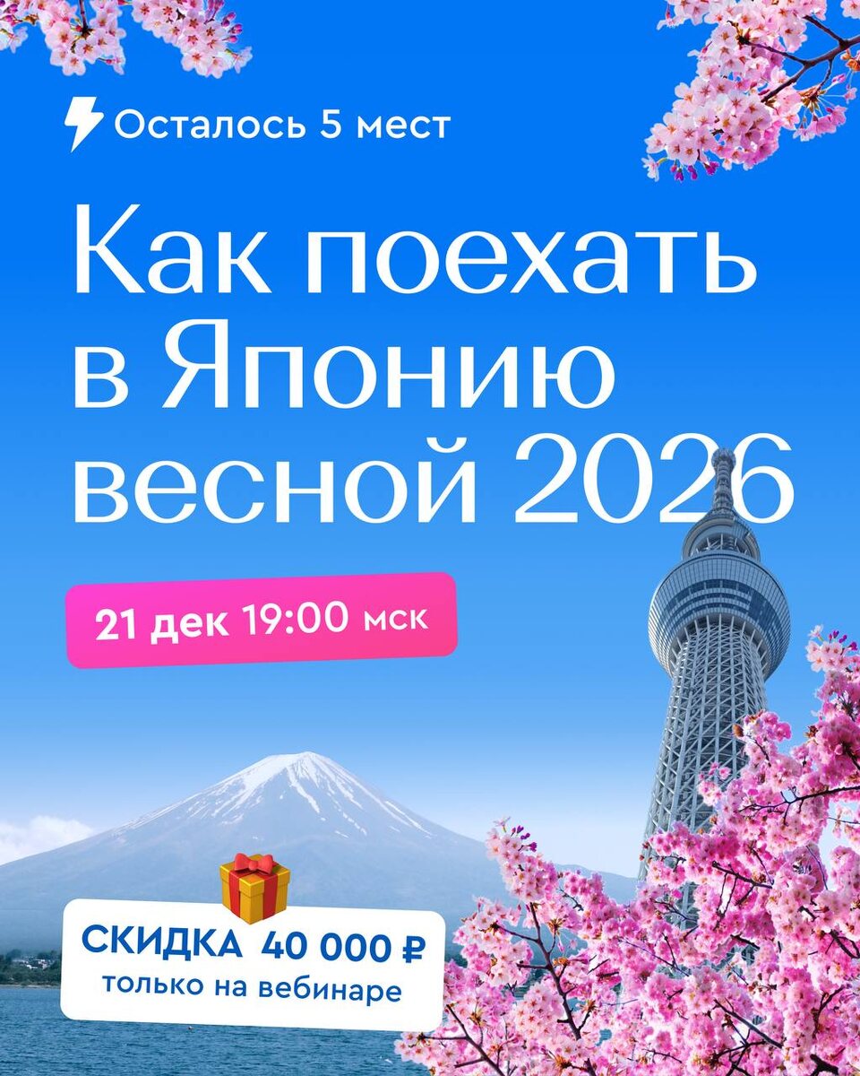 ? Есть отличная новость – уже завтра в 19:00 наши друзья из TokyoTrip (уже 6 лет делают поездки в Японию) снова устраивают бесплатный вебинар «Как поехать в Японию весной 2026» Вы пообщаетесь с прошлыми участниками, узнаете их ощущения и получите скидку 40 тысяч рублей — только на вебинаре! Что вы еще получите на вебинаре: ✔️ узнаете, как оказаться в Японию в 2026 – пошагово ✔️ как устроен лагерь в Японии, все детали ✔️как этой весной побывать в Токио, Киото, Нара ✔️ кому подойдет поездка ✔️ стоимость, расходы ✔️ перелет, советы в путешествии ✔️ ответы на любые вопросы 🎤 Спикер: Георгий Пономаренко, основатель TokyoTrip (6 лет учился в Японии, закончил Tokyo International Business College) Количество мест ограничено 🗓️ 21 дек (завтра) 19:00 МСК 👉 Принять бесплатное участие