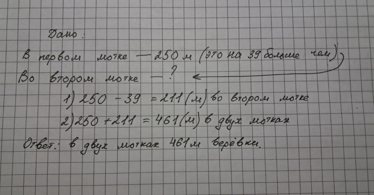 Дано: В первом мотке — 250 м верёвки. Это на 39 м больше, чем во втором мотке. Найдем длину верёвки во втором мотке: 250 м − 39 м = 211 (м) Найдем длину верёвки в двух мотках вместе: 250 м + 211 м = 461 (м) Ответ: В двух мотках всего 461 метр верёвки.