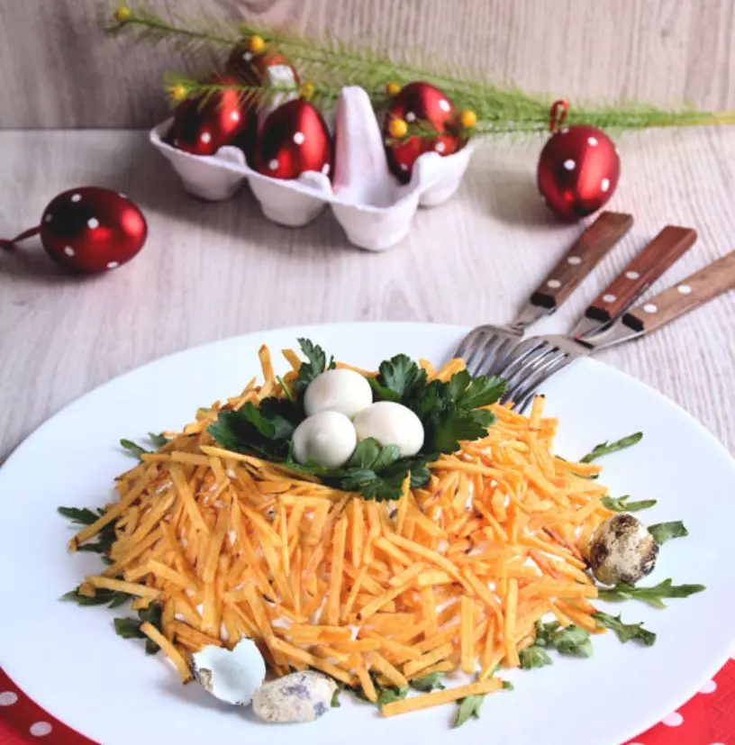 Любите сытные салаты, похожие на оливье? Попробуйте вот такие варианты для разнообразия. 200 гр. вареного куриного филе 200 гр. грибов 1 луковица 2 вареных куриных яйца 2 соленых огурца 100 гр. майонеза 100 гр. сыра 2-3 веточки петрушки 3 перепелиных яйца майонез картофельная соломка (чипсы) Нарежьте лук и грибы, обжарьте на растительном масле. Мелко нарежьте курицу. Добавьте майонез, мелко нарезанные огурцы, тертые вареные яйца, сыр и нарезанную петрушку. Соль по вкусу. Выложите смесь на тарелку в форме купола. Сверху распределите жареный лук и грибы. Сформируйте гнездо и покройте небольшим количеством майонеза.