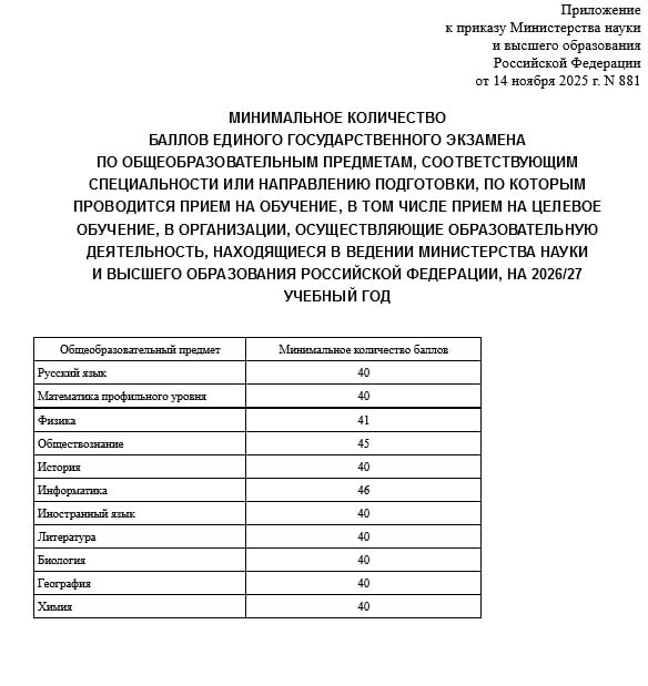 ❗️ Минобрнауки установило минимальный порог сдачи ЕГЭ для поступающих в государственные вузы на 2026-2027 годы: русский язык, математика
