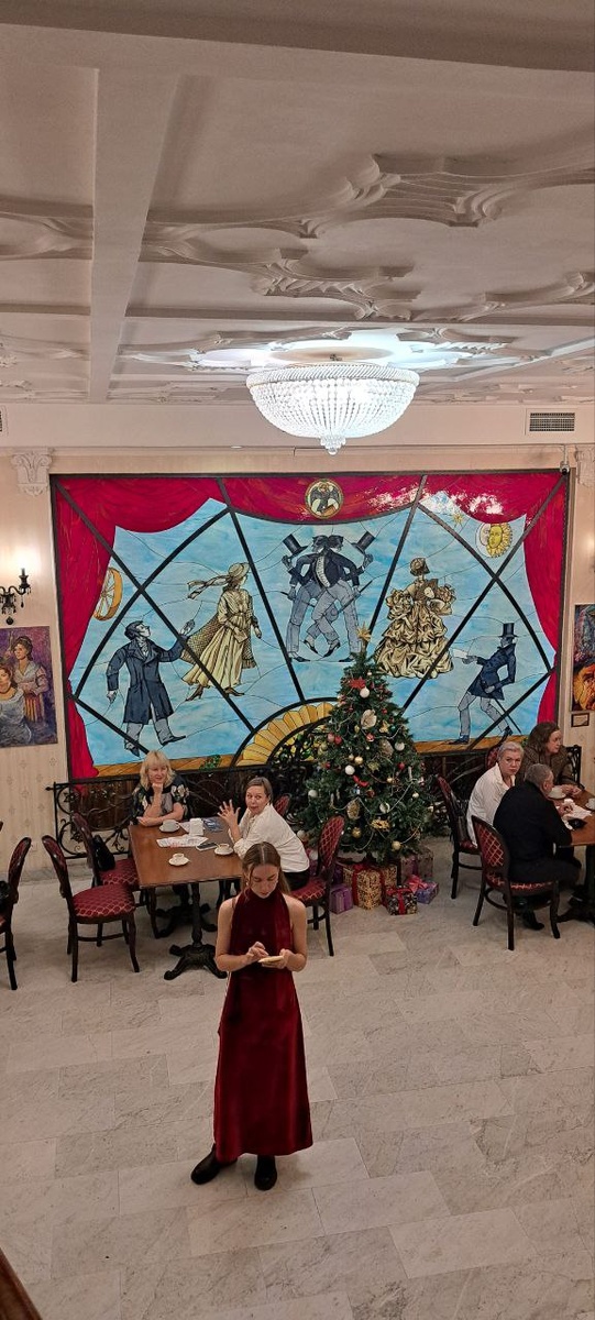 Буфет находится в просторном помещении, в которое можно пройти из фойе первого этажа. В кафе есть картины с портретами известных артистов.