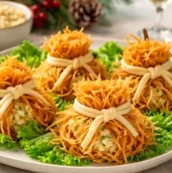 Вдохновением для рецепта послужила любовь лошадей к простым, натуральным продуктам. Сено — одно из основных зимних лакомств этих благородных животных. Именно поэтому в основе блюда — хрустящая картофельная «соломка», обрамляющая нежную начинку из отварной курицы, плавленого сыра, свежего огурца и пикантного чеснока. Умелая подача делает эту закуску визуально эффектной и праздничной!