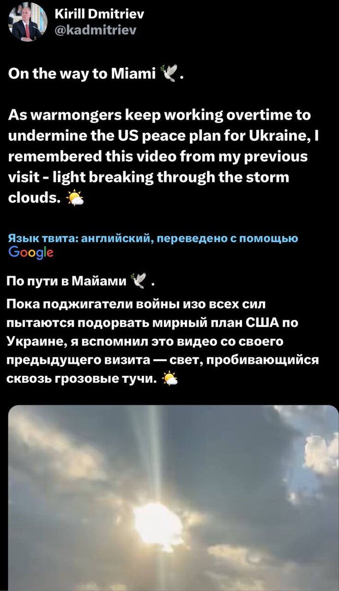 Кирилл Дмитриев уже на пути в Майами, где пройдут переговоры с Уиткоффом и Кушнером, сообщил сам глава РФПИ