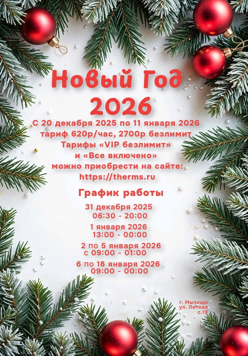 ! ✨🎉 С 20 декабря по 11 января мы превращаем привычные каникулы в яркое шоу с горячим паром 💨 и веселыми брызгами 💦. Ваш пропуск в эпицентр праздника: 620 рублей за час или 2700 рублей за безлимитный день драйва и отдыха. Тарифы «VIP безлимит» и «Все включено» для тех, кто хочет всё и сразу, доступны на сайте https://therms.ru/vip-mt/ График, подстроенный под ваше настроение: 31 декабря (06:30–20:00): идеальный момент, чтобы перезагрузиться перед главной ночью года. 1 января (13:00–00:00): начинаем год с чистого листа и бодрого заплыва. 2–5 января (09:00–01:00): гуляем по-взрослому! 🎉 Праздничная программа, музыка 🎶 и драйв до самой ночи 🌙. 6–18 января (09:00–00:00): удерживаем праздничную волну и продолжаем заряжаться энергией. Ждем вас там, где каникулы оживают: 🏖️г. Мытищи, ул. Летная, с. 19. ✈️Врывайтесь в 2026-й на максимальной скорости релакса!
