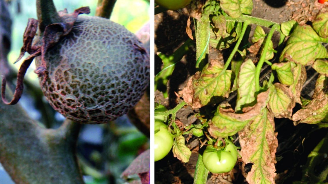 ❗️ Проблема: в фазу сбора урожая выбор препаратов резко сужается. Нужно что-то безопасное для плодов, с коротким сроком ожидания и щадящее для полезных энтомофагов. ☝️Наиболее благоприятной средой для размножения томатного ржавого клеща считается сочетание температуры около 27 °C и низкой относительной влажности воздуха на уровне примерно 30%. В таких условиях вредитель быстро распространяется, формируя плотные скопления на листьях, стеблях и плодах томата, при этом развитие личинок занимает всего 5–7 суток. Питание клеща за счёт тканей листьев и побегов приводит к заметному снижению урожайности и ухудшению товарных качеств плодов, а при сильном поражении растения могут полностью погибать. Первые признаки повреждения проявляются в виде округлых пятен буроватого оттенка на листьях и стеблях. С нижней стороны листовой пластинки эти участки имеют тёмно-бурную или фиолетовую окраску. Поверхность листьев приобретает характерный блеск, поскольку верхний слой клеток отмирает и отделяется от