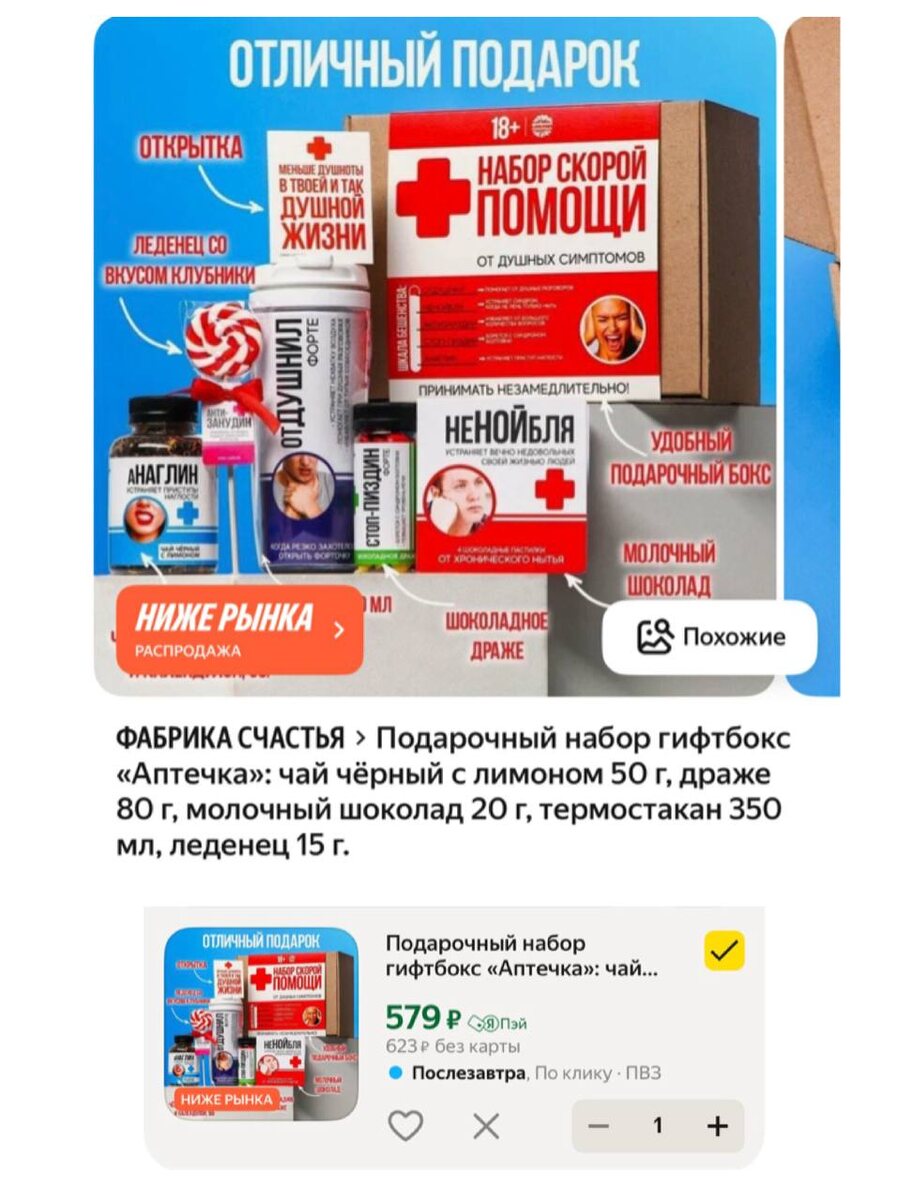 ? 😁😏 Подарочный набор гифтбокс «Аптечка»: чай чёрный с лимоном 50 г, драже 80 г, молочный шоколад 20 г, термостакан 350 мл, леденец 15 г. https://market.yandex.ru/cc/8JTVMR 10% скидка по промо BYSIMA10 🛍DEC122-AF — скидка 100 ₽ на один любой заказ от 5000 ₽ ✅ Канал по скидкам 🔣 Бот с промокодами