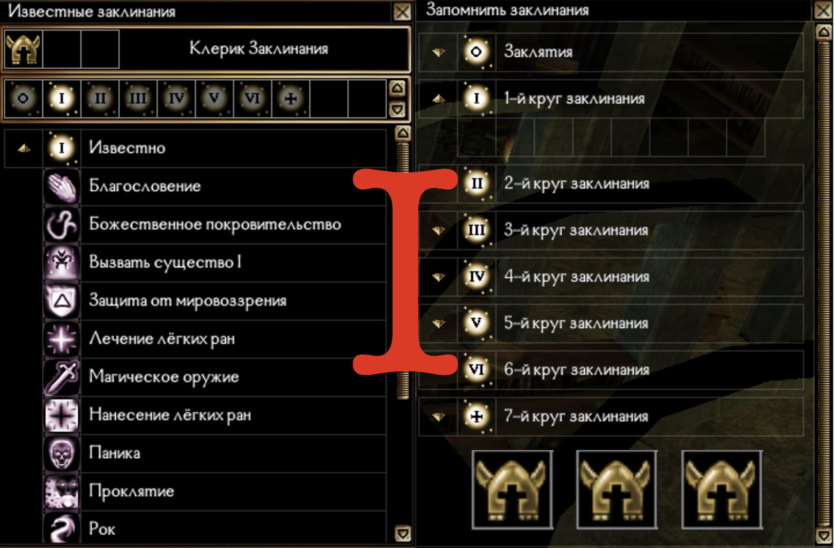 Без Паники! В прямом смысле — без этого заклинания обойдёмся. Здесь слишком много недостатков: короткий срок (6-24 секунды), есть спасбросок, ограничение по уровню цели и совсем маленькая дистанция применения. Да и штраф звёзд с неба не хватает: -2 к бонусу атаки, спасброскам и урону, но не к родному урону, а магическому, если он есть. С начала игры мы про него забываем и не вспоминаем, да и когда вспоминать-то — потом Паника уже ни на кого не воздействует. У священника на первом уровне слишком много полезных заклинаний, а слотов мало, чтобы помещать туда Панику.
