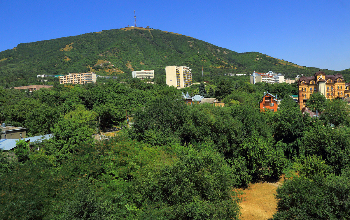 Предыдущая публикация (https://dzen.ru/a/aUVtqnOP8CSsQz5l ) закончилась на том, что мы, прогулявшись по ущелью реки Аманауз к водопадам, спустились в поселок и начали собираться к переезду в Пятигорск. Около 7 утра мы дождались автобуса у отеля и покинули гостеприимный Домбай. В Черкесске мы пересели на автобус следовавший в Пятигорск и в 13 часов благополучно заселились в номер отеля "Интурист", из которого открывался шикарный вид на гору Машук. Правда, вид на Эльбрус (находящегося на юге) отсутствовал. Впрочем, прозрачность воздуха в этот период была такова, что если бы даже вид был, то Эльбруса все равно видно бы не было. После обеда мы отправились гулять по городу. Нашей целью была канатная дорога на вершину Машука. Впрочем, начали прогулку мы с окрестностей отеля. Должен сказать, что много раз был в Пятигорске и каждый раз гулял по городу с огромным удовольствием. Впрочем, это касается и других городов Северного Кавказа, сохранивших "шарм" начала прошлого века. От отеля до