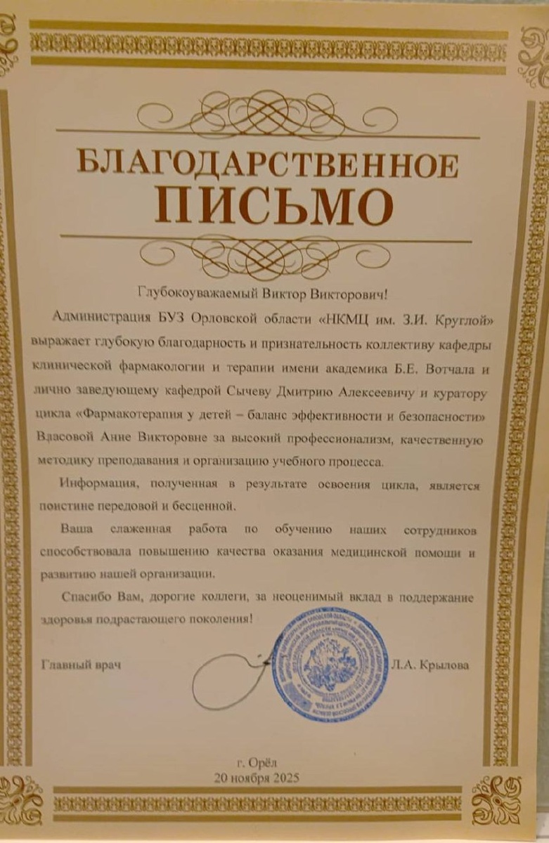 академика Б.Е. Вотчала В адрес и.о. ректора РМАНПО академика РАН Виктора Викторовича Фомина направлено благодарственное письмо, подписанное главным врачом БУЗ Орловской области «Научно-клинический многопрофильный центр имени З.И. Круглой» Л.А. Крыловой. В нем – слова благодарности за обучение сотрудников лечебного учреждения на цикле «Фармакотерапия у детей – баланс эффективности и безопасности». 🤍 Глубокоуважаемый Виктор Викторович! Администрация БУЗ Орловской области «НКМЦ им. З.И. Круглой» выражает глубокую благодарность и признательность коллективу кафедры клинической фармакологии и терапии им. академика Б.Е. Вотчала, лично заведующему Дмитрию Алексеевичу Сычеву и куратору цикла «Фармакотерапия у детей – баланс эффективности и безопасности» Анне Викторовне Власовой за высокий профессионализм, качественную методику преподавания и организацию учебного процесса. Информация, полученная в результате освоения цикла, является поистине передовой и бесценной. Ваша слаженная работа по