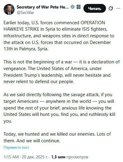 «Сегодня утром американские войска начали операцию «Удар Хоукай» в Сирии с целью уничтожения боевиков *ИГИЛ, инфраструктуры и позиций с оружием в ответ на нападение на американские войска 13 декабря в Пальмире, Сирия. Это не начало войны — это декларация мести. Соединенные Штаты Америки под руководством президента Трампа никогда не будут колебаться и никогда не отступят в защите своего народа. Как мы заявили сразу после жестокого нападения, если вы нападаете на американцев — где бы то ни было в мире — вы проведете остаток своей короткой, тревожной жизни, зная, что Соединенные Штаты будут охотиться за вами, найдут вас и безжалостно убьют вас. Сегодня мы охотились и убивали наших врагов. Многих из них. И мы будем продолжать.»,— написал Хегсет в соцсети X. *ИГИЛ организация ЗАПРЕЩЕНА❗️ на территории РФ. #сирия #сша 💬 The head of the Pentagon, Pete Hegseth, said that American troops have launched an anti-terrorist operation in Syria. "This morning, American forces launched Operation Ha