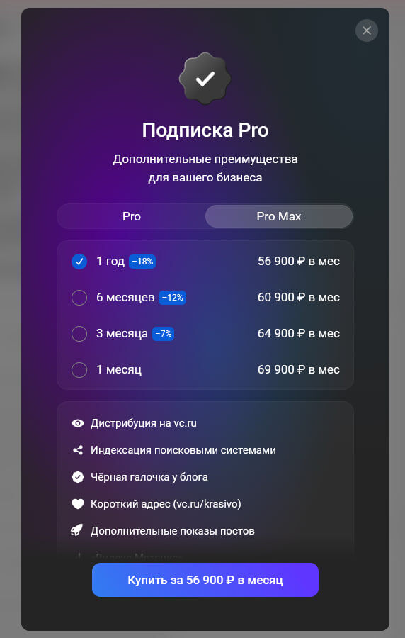 Написала я первый текст для них, мне дали доступ к VC, захожу я туда, публикую эту статью и мне всплывает предупреждение. Оказывается, что блок зарегистрирован как корпоративный, поэтому если не оплатить подписку, система статьи в ленте публиковать не будет, а еще не будет индексации... То есть вы господа пишите, но текст увидят только ваши подписчики. А подписка стоит не хило так, не менее 56900 рублей в месяц!!! Я CEO написала об этом, он призадумался. Ради индексации 2-3 статей в месяц такие деньги платить жалко.