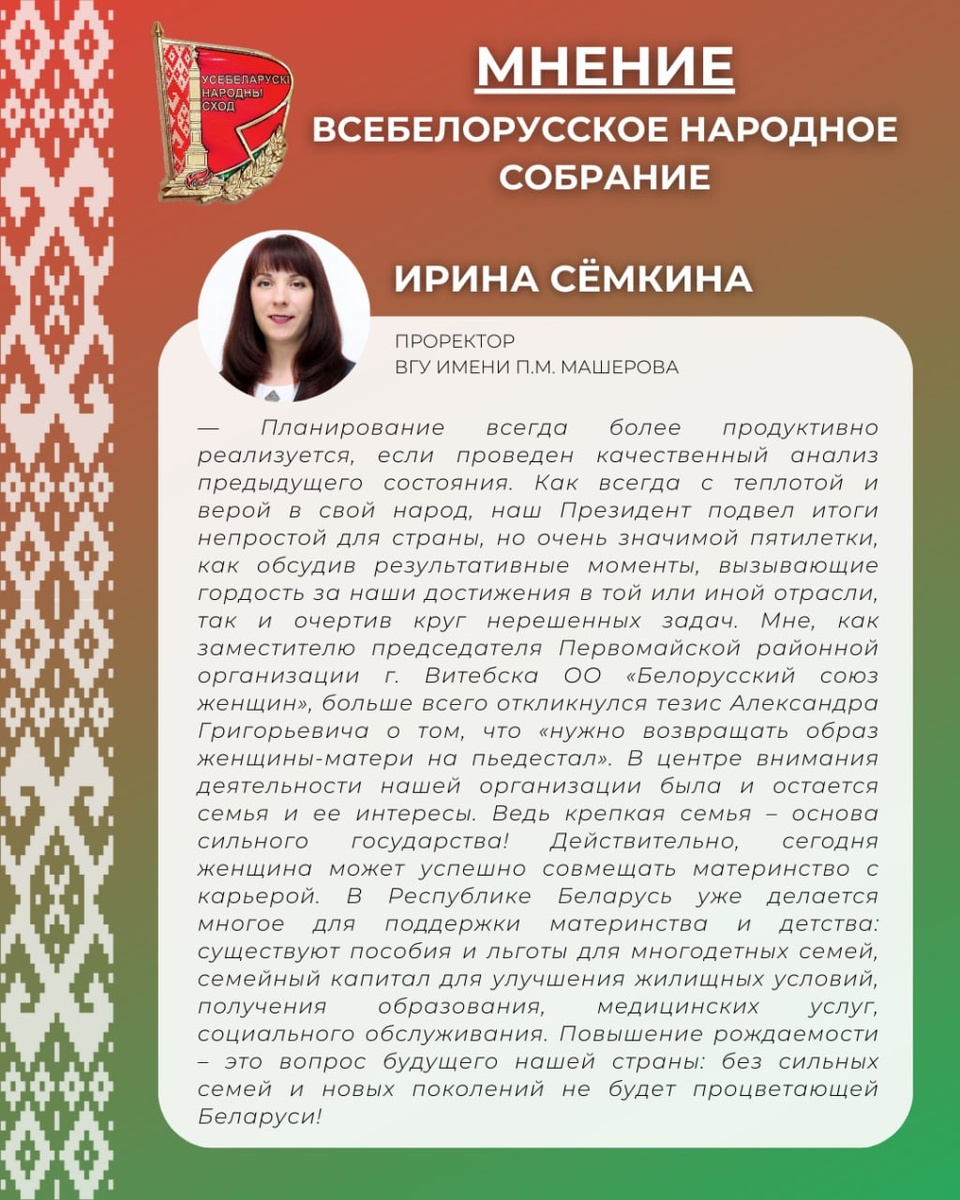 🔴Проректор ВГУ имени П.М. Машерова Ирина Сёмкина о Втором заседании VII Всебелорусского народного собрания — Планирование всегда более продуктивно реализуется, если проведен качественный анализ предыдущего состояния. Как всегда с теплотой и верой в свой народ, наш Президент подвел итоги непростой для страны, но очень значимой пятилетки, как обсудив результативные моменты, вызывающие гордость за наши достижения в той или иной отрасли, так и очертив круг нерешенных задач. Мне, как заместителю председателя Первомайской районной организации г. Витебска ОО «Белорусский союз женщин», больше всего откликнулся тезис Александра Григорьевича о том, что «нужно возвращать образ женщины-матери на пьедестал». В центре внимания деятельности нашей организации была и остается семья и ее интересы. Ведь крепкая семья – основа сильного государства! Действительно, сегодня женщина может успешно совмещать материнство с карьерой. В Республике Беларусь уже делается многое для поддержки материнства и детств