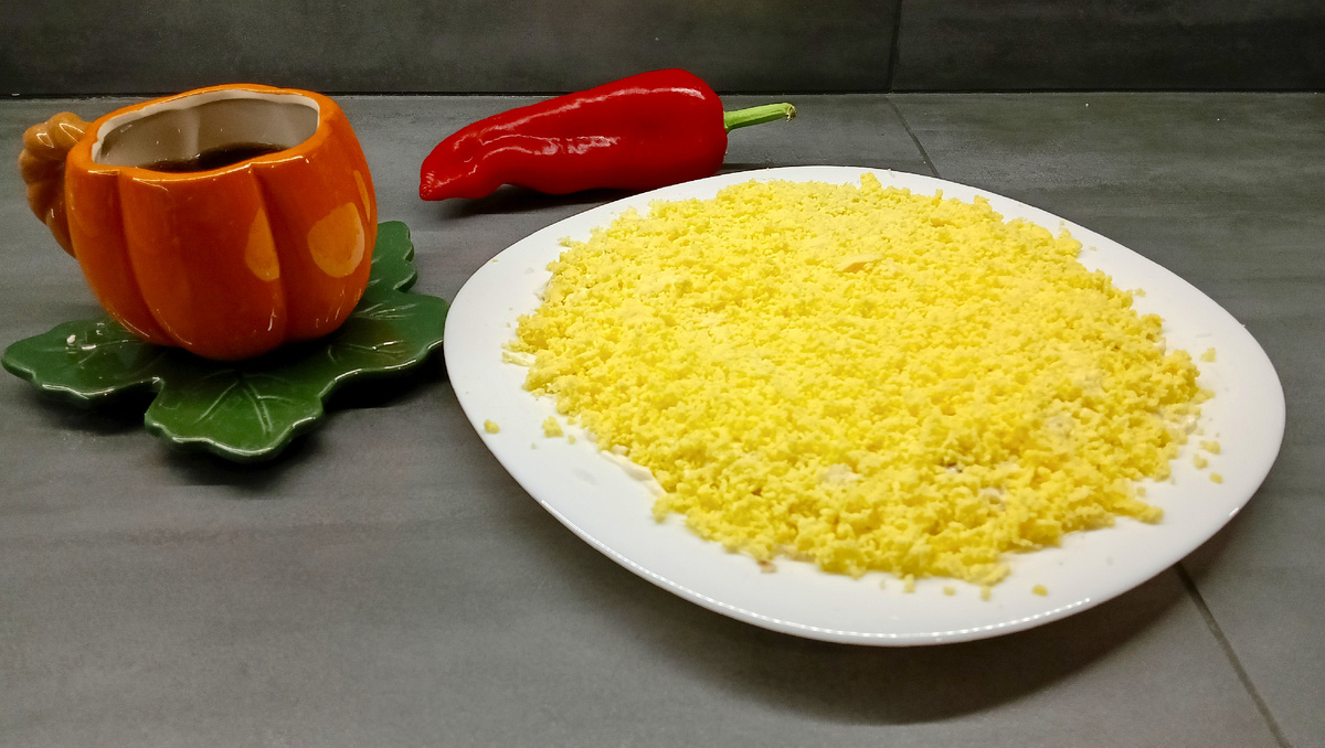 6. Шестой слой (финальный): Натрите желтки на мелкой тёрке и украсьте ими салат, создавая «пушистую» шубку, как цветок мимозы.
