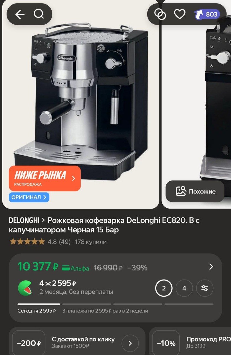 Рожковая кофеварка DeLonghi EC820. B с капучинатором Черная 15 Бар