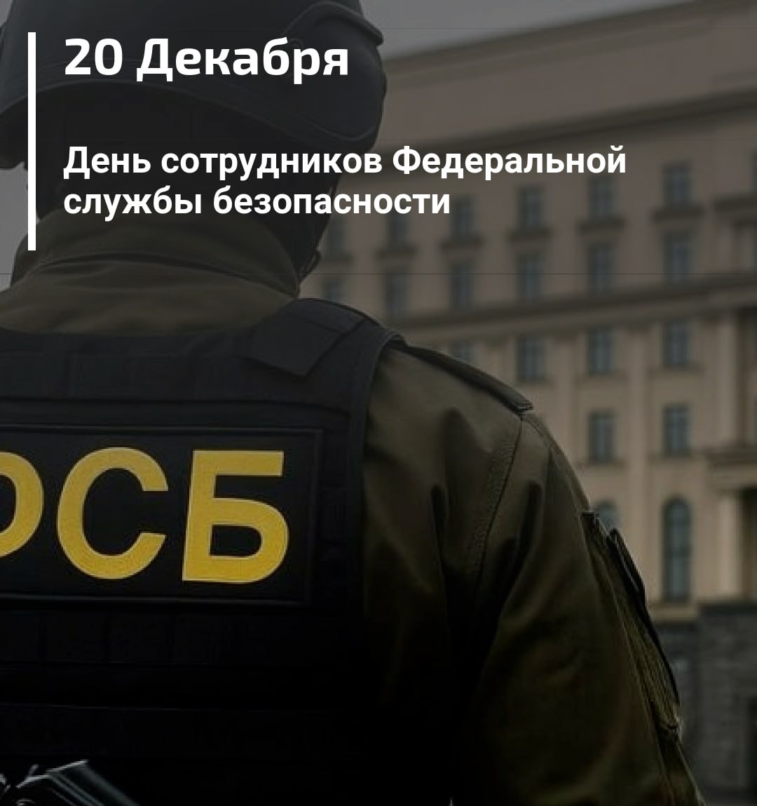 20 декабря в России ежегодно отмечается День работника органов безопасности Российской Федерации (День ФСБ). Это профессиональный праздник сотрудников Федеральной службы безопасности (ФСБ), Службы внешней разведки (СВР), Федеральной службы охраны (ФСО) и других спецслужб России. Дата праздника установлена указом Президента РФ №1280 от 20 декабря 1995 года. Выбор даты связан с историческим событием: в этот день в 1917 году Совет народных комиссаров РСФСР издал Декрет об образовании Всероссийской чрезвычайной комиссии (ВЧК) по борьбе с контрреволюцией и саботажем при СНК РСФСР (предшественника современных органов безопасности). До 1995 года 20 декабря отмечался советскими органами госбезопасности неофициально как «День чекиста». В День ФСБ проходят, например: - Торжественные мероприятия в центральном аппарате и региональных управлениях ФСБ. - Встречи действующих служащих с ветеранами службы, на которых последние делятся профессиональным опытом с молодым поколением. - Торжественный при