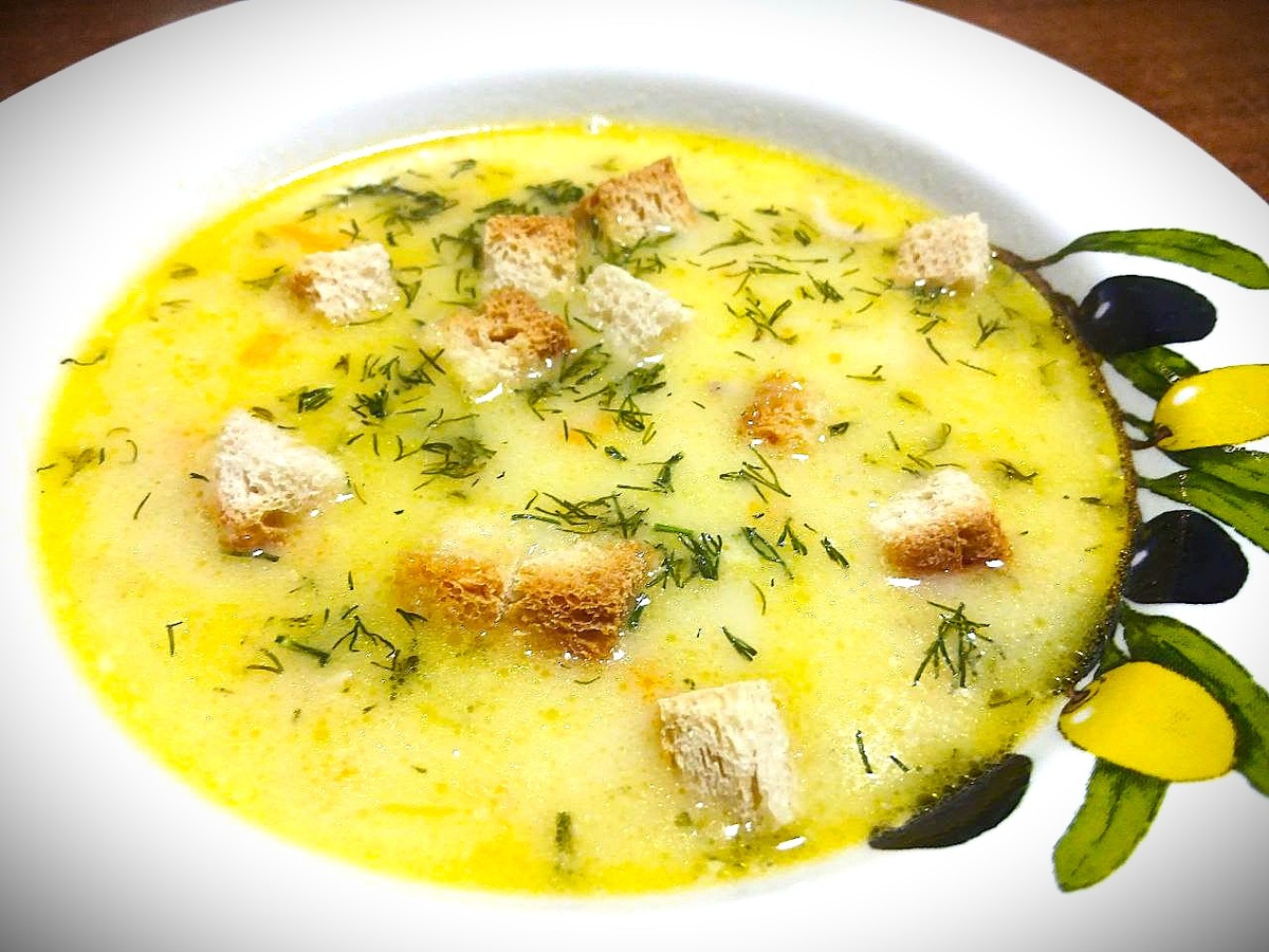 Сырный суп с хрустящими сухариками.