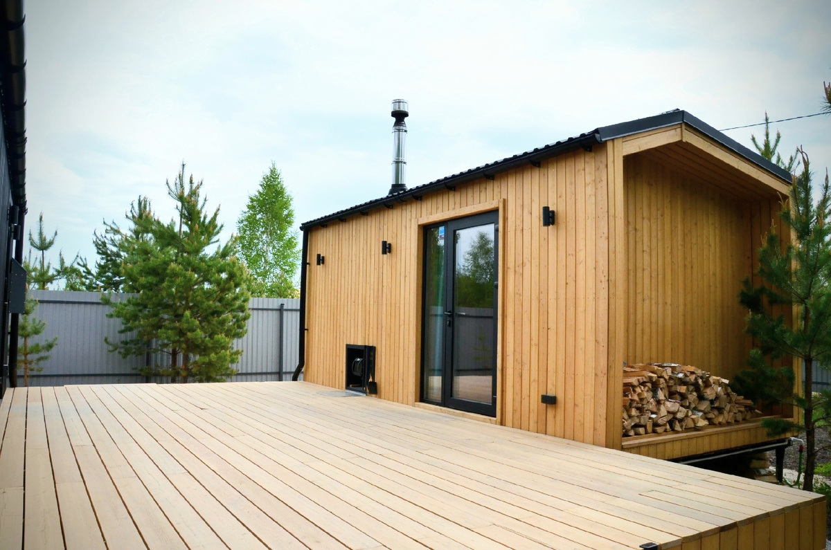 - Фасад: Мы используем декоративный скошенный планкер из сосны сорта АВ, покрытый фасадной лазурью Tikkurila.