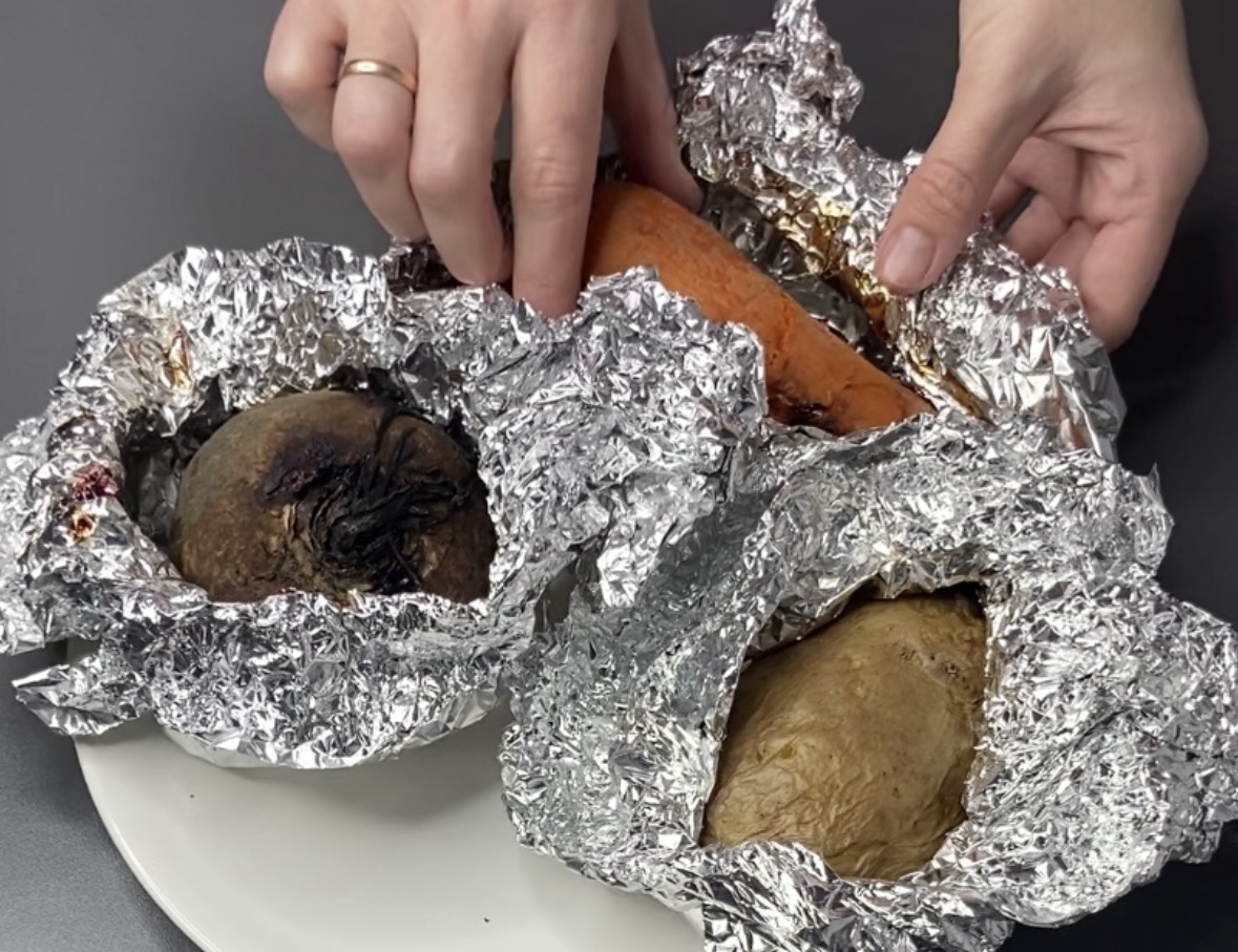Свёклу, морковь и картофель тщательно моем. Каждый овощ заворачиваем в фольгу блестящей стороной внутрь и отправляем в духовку. Запекаем при температуре 180 °C до мягкости. В среднем это занимает 30–40 минут, но время зависит от размера овощей. Готовность удобно проверять деревянной шпажкой.