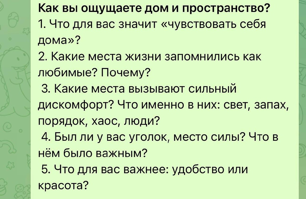 Прошу клиентов вместе (семьей) отвечать в формате аудио или текстом, по очереди. Мне кажется, это даже для поговорить вечером, вместо фильма, очень сближающие и классно может быть ❤️ В конце анкеты я даю пояснения из разряда: если вам важно все контролировать, то вам могут подойти закрытые системы хранения, минимализм. Если вы тревожны, вас поддержит- пледы, мягкие текстуры, натуральные материалы, ниши и уютные зоны. Такую анкету и анализ я буду проводить только с теми клиентами, кто приходит на разработку проекта планировки. Это чертежи подробные. В начале всегда консультация стандартная, а после можно пойти глубже, дальше- в проект планировочного решения. Может еще дальше я начну делать дополнительные визуальные подборки для проекта планировки: подбор референсов с пояснением что, где, зачем, почему, в чем суть и смысл предлагаемых решений. Это для тех, кто хочет и планирует сам делать ремонт, подбирать все, но нужна дорожная карта и ориентиры.