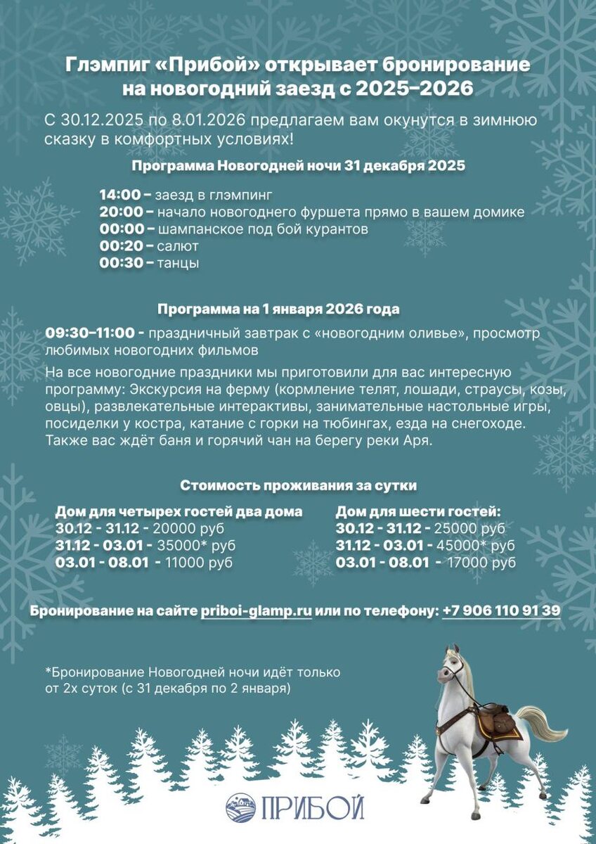 Новогодняя ночь 31 декабря 2025: • 14:00 - заезд в глэмпинг • 20:00 - начало фуршета прям в вашем домике • 00:00 - шампанское под бой курантов • 00:20 - праздничный салют • 00:30 - новогодние танцы Программа на 1 января 2026 года • 09:30-11:00 - праздничный завтрак с «новогодним оливье» На все новогодние праздники мы приготовили для вас интересную программу: развлекательные интерактивы, занимательные настольные игры, посиделки у костра , катание с горки, тюбинг, экскурсия на ферму , кайтинг Также вас ждёт баня с чаном на берегу реки Аря. Развлечения включены в стоимость проживания, доп. услуги (баня с чаном ) оплачиваются по прайсу. Стоимость проживания за сутки Дом для шести гостей: 30.12 - 31.12 - 25000 руб 31.12 - 03.01- 45000* руб 03.01 - 08.01 - 17000 руб Дом для четырех гостей два дома 30.12 - 31.12 - 20000 руб 31.12 - 03.01 - 35000* руб. 03.01 - 08.01 - 11000 руб