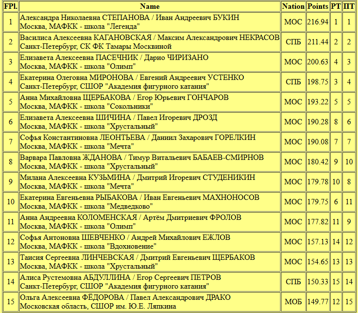 Не дали повода, здесь и сейчас, усомниться в своем лидерстве Саша Степанова/Иван Букин (216.94 - 1 место🥇), теперь уже пятикратные чемпионы России (больше золотых медалей только у Бобровой/Соловьева). Их произвольный танец "Орфей и Эвридика" - это полная гармония между мужчиной и женщиной, доверие, лиричность и высочайшее техническое мастерство, выработанное за уже два десятилетия совместной карьеры. Перспективная молодая пара совсем рядом и это должно помогать Саше с Иваном сохранять повышенную мотивацию и продолжать искать какие-то новые хореографические краски и технические усложнения в своих будущих программах.