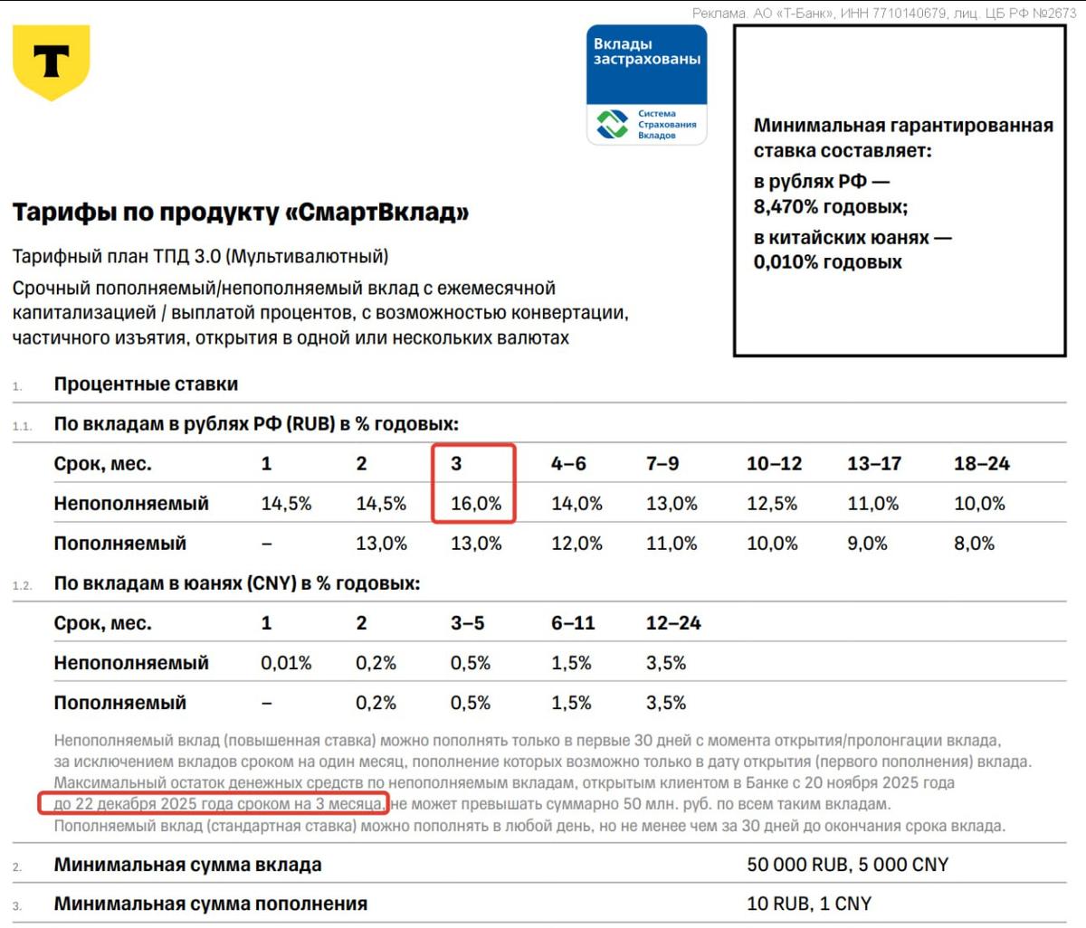 ☝️ Судя по всему, условия по Смарт Вкладу со ставкой 16% годовых на 3 месяца будут действовать только до 22 декабря — дальше, скорее всего, снизят на фоне изменения ключевой ставки ЦБ. Если актуально зафиксировать ставку с возможностью пополнения в течение 30 дней, можно открыть депозит с минимальной суммой 50 000 руб. ✅ Ставка 16% годовых, с учётом капитализации доходность составит 16,21% — срок 3 месяца, без частичного снятия. ✅ Формально вклад непополняемый, но первые 30 дней его можно пополнять от 10 руб. до 50 млн руб. суммарно по всем трёхмесячным непополняемым вкладам. ✅ Ставка не зависит от наличия подписок Pro, Premium или Private. ✅ В банке можно иметь не более 8 вкладов одновременно. 👉 Открыть вклад в Т-банке