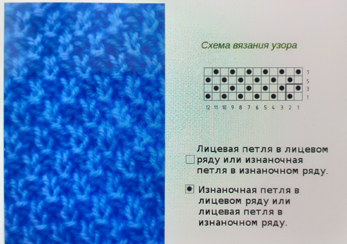 1 ряд : 1 кромочная петля , * 1 лицевая петля , 1 изнаночная петля * 1 лицевая петля , 1 кромочная петля.