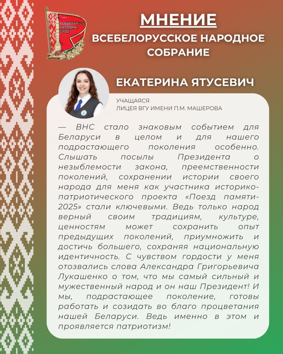 🔴Учащаяся Лицея ВГУ имени П.М. Машерова Екатерина Ятусевич о Втором заседании VII Всебелорусского народного собрания — ВНС стало знаковым событием для Беларуси в целом и для нашего подрастающего поколения особенно. Слышать посылы Президента о незыблемости закона, преемственности поколений, сохранении истории своего народа для меня как участника историко-патриотического проекта «Поезд памяти- 2025» стали ключевыми. Ведь только народ верный своим традициям, культуре, ценностям может сохранить опыт предыдущих поколений, приумножить и достичь большего, сохраняя национальную идентичность. С чувством гордости у меня отозвались слова Александра Григорьевича Лукашенко о том, что мы самый сильный и мужественный народ и он наш Президент! И мы, подрастающее поколение, готовы работать и созидать во благо процветания нашей Беларуси. Ведь именно в этом и проявляется патриотизм! #ВНС