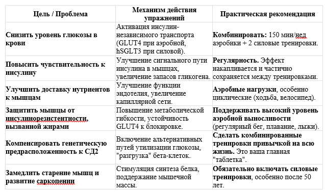 Вывод: Комбинация аэробных и силовых тренировок — "золотой стандарт" для максимального воздействия на все этапы усвоения глюкозы: от доставки кровью (аэробика) до транспорта в клетку через независимые от инсулина каналы (силовые).