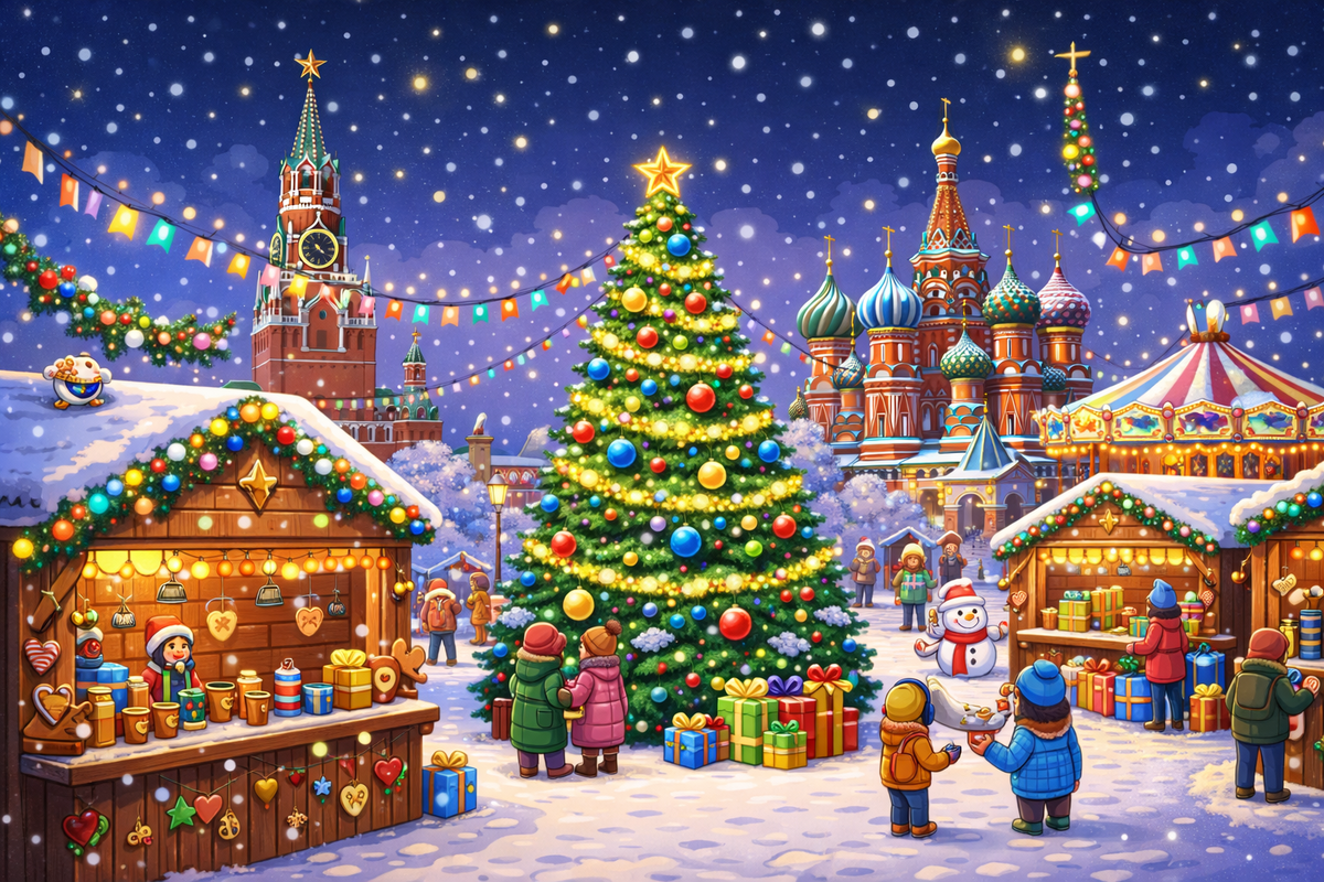 - 📍 Красная площадь с елкой и световыми инсталляциями.