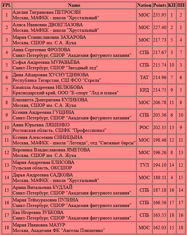 На последнее место в итоге приехала Маша Мазур (162.03 - 18 место). Разволновалась и совсем не справилась со своей произвольной программой, хотя короткую откатала очень успешно. Петербурженки Ева Зубкова (163.55 - 17 место) и Мария Пулина (166.56 - 16 место) могли бы выступить на этом турнире лучше, но участие в Чемпионате России для них уже большое событие в карьере. А вот еще одну фигуристку из Санкт-Петербурга Арину Кудлай (187.18 - 15 место) уже можно поздравить не только с участием в ЧР, но и с очень достойными баллами. В произвольной программе по технике она набрала 69! баллов. Не удивлюсь, если и через год Арина также пройдет отбор на наш главный старт.