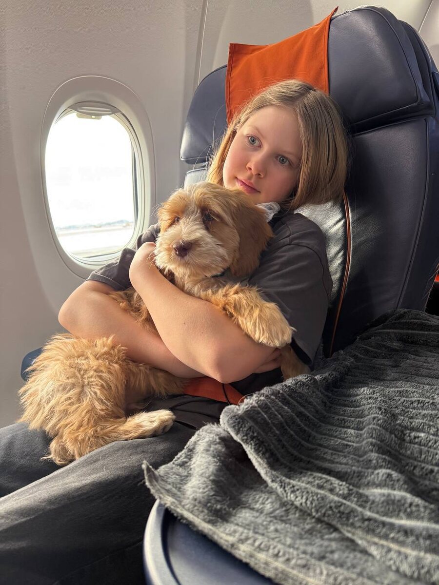 , когда на руках твой самый теплый «пилот» 😊 На фото — наш выпускник Лучи и его любимая хозяйка Александра ✈️🤍 #перелетщенка #собакавсамолете #перелетсобакой #путешествиесщенком #лабрадудли #австралийскийлабрадудль #щенкилабрадудли #labradoodle
