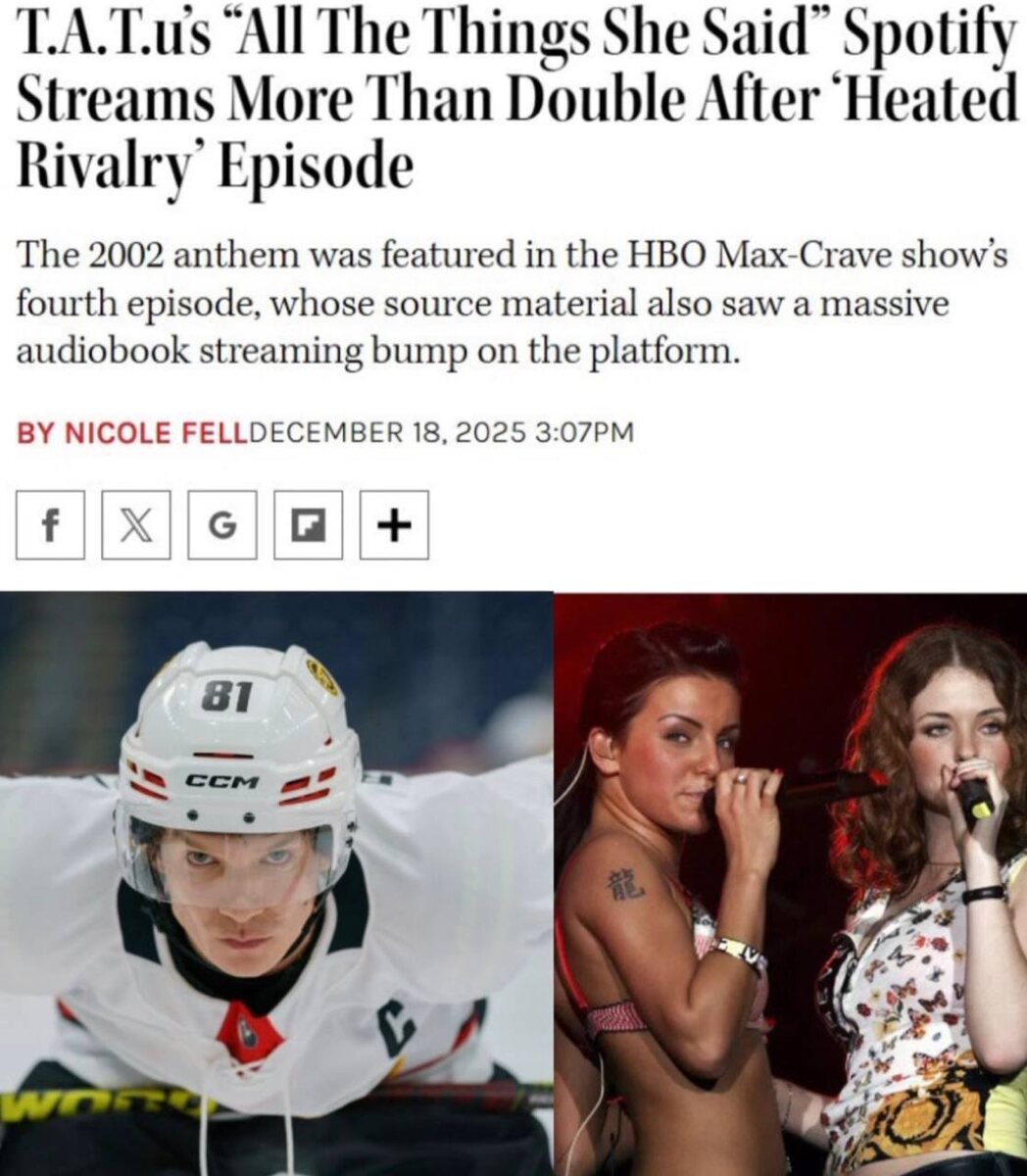 хоккейных матчах в США и Канаде, а за последние пару дней на Спотифай ее послушали уже более миллиона раз (прирост на 135%). Что же случилось? Всё дело в свежей серии хоккейного сериала HBO про крепкую мужскую дружбу, «Жаркое соперничество». Тот самый «сериал про хоккеистов», где молодой россиянин и канадец играют в разных сборных, но глобально они из одной команды. На льду они заклятые враги, а в жизни, ну вы понимаете, Роскомнадзор. В одной из самых драматичных сцен звучит именно хит группы ТаТу. Сам сериал уже ворвался в топы по просмотрам, метит на «Золотой глобус», а критики называют его революционным и одним из самых увлекательных шоу года. Он и правда неплохой, хотя в России его покажут едва ли, даже на самых пиратских сервисах.