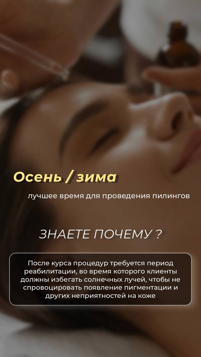 ✨ Вот несколько причин, почему вам стоит записаться на процедуру пилинга прямо сейчас: 1. Защита от сухости и шелушения: Зимой воздух становится сухим (из-за отопления в помещениях и мороза на улице). Это приводит к обезвоживанию и шелушению. Пилинг деликатно удаляет омертвевшие клетки, позволяя уходовым средствам (кремам, сывороткам) проникать глубже и работать эффективнее. 2. Минимальный риск пигментации: Ультрафиолетовое излучение зимой значительно слабее, чем летом. Это критически важно для процедур химического пилинга, так как после них кожа становится более чувствительной к солнцу. Процедура, проведенная зимой, минимизирует риск появления нежелательной пигментации. 3. Борьба с тусклым цветом лица: Холод, недостаток витаминов и малое количество солнечного света делают цвет лица серым и уставшим. Пилинг стимулирует обновление клеток, возвращая коже здоровое сияние и свежий вид. Запишитесь на консультацию и подбор идеального пилинга уже сегодня! Ссылка для онлайн записи: 👉 pr
