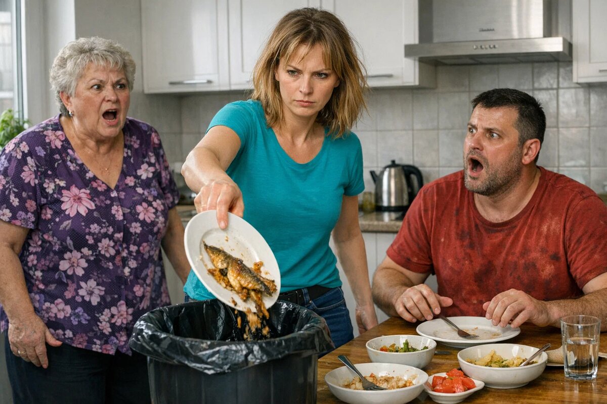 Марина взяла его тарелку — ту, на которой ещё оставалась рыба, — и понесла к мусорному ведру. Виктор проводил её взглядом, не понимая. Марина открыла крышку и вытряхнула туда всё содержимое. Рыба упала с глухим стуком.