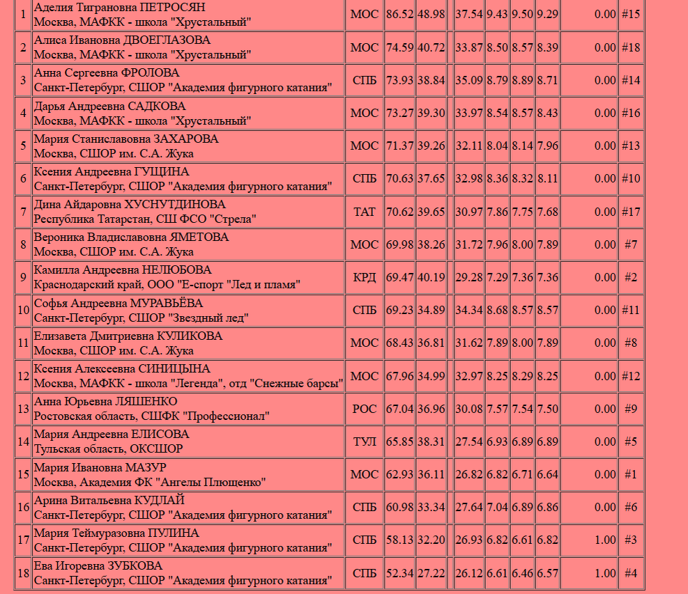 Третье предварительное место Анны Фроловой с суммой 73,93 балла кажется насмешкой для фигуристок с тройным акселем. Ну в окончательной тройке её точно не должно быть, потому что ей не позволят бороться за высокие места простые каскады и низкая базовая стоимость элементов. Максимум её могут протащить в расширенный состав сборной, но и то при сносном исполнении произвольной и падениях с четверных других претенденток.