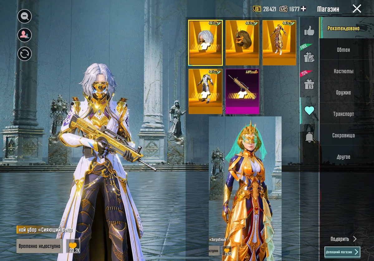 Золотые костюмы, показанные на изображении, вернутся в следующем обновлении и появятся в Ultimate-рулетках. Кроме повторного выхода, облики получат новые эффекты: добавят уникальную стойку, а также слегка обновят внешний вид. Так что если какого-то из этих костюмов не хватало в коллекции — появится отличный шанс закрыть пробел. Наш бот для пополнения UC: @OneTwoPay_bot 😎 PUBG Mobile