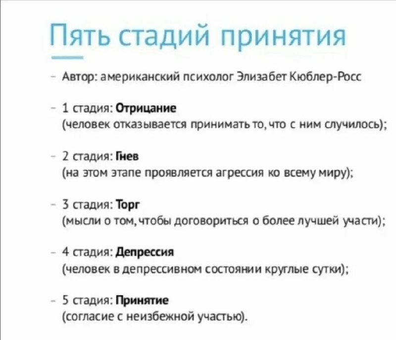 изменений в жизни. Изначально модель создавалась для работы с неизлечимо больными пациентами, но со временем оказалось, что эти стадии универсальны и применимы в любых ситуациях, связанных с потерями или радикальными переменами в жизни.