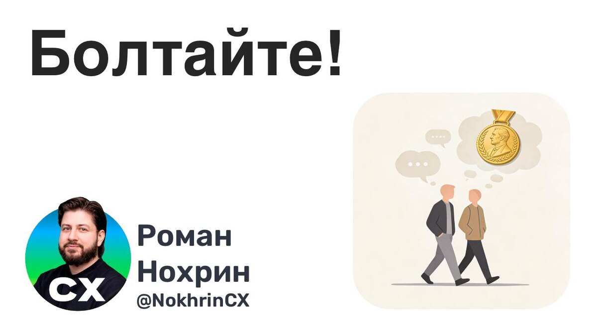 Канеман и Тверски 15 лет занимались исследованиями, которые потом принесли им Нобелевскую премию. Внимание! Делали они это, гуляя и придумывая вопросы, на которые давали друг другу интуитивные ответы. И это они назвали «15-ю годами проведения исследований»! Так что, думаю, можно смело болтать с друзьями — перетирать все косточки, обсуждать гипотетические вопросы и придумывать на них ответы. Глядишь, и Нобелевскую премию потом получишь. Главное — быть системным, делать это долго, обстоятельно и, желательно, с одними и теми же людьми 🙂 Болтаем! #cx #клиентскийопыт Канал о клиентском опыте и управлении: 📣 NokhrinCX