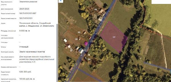 хозяйства (приусадебный земельный участок) (код 2.2), с кадастровым номером 58:25:0510101:887, общей площадью 5000 кв.м., адрес (местоположение) объекта: Пензенская область, Сердобский район, с. Мещерское, ул. Вяземского. Цель использования - для ведения личного подсобного хозяйства в границах населенного пункта. Канал: Госземля Пензенская область Область: обл Пензенская Район: м.р-н Сердобский Населенный пункт: с.п. Мещерский сельсовет, с Мещерское, ул Вяземского Локация: Смотреть на карте ВРИ: Для ведения личного подсобного хозяйства (приусадебный земельный участок) Кадастровый номер: 58:25:0510101:887 Кадастровая стоимость: - Вид сделки: Аренда Площадь: 5000 м² Начальная цена: 16790.00 руб. Дата завершения: 19.01.2026 Подробнее: ГИС ТОРГИ #госземля #земляотгосударства #земля #земельныйучасток #земельныеторги #торги #аукцион #арендаземли #аренда #пензенскаяобласть