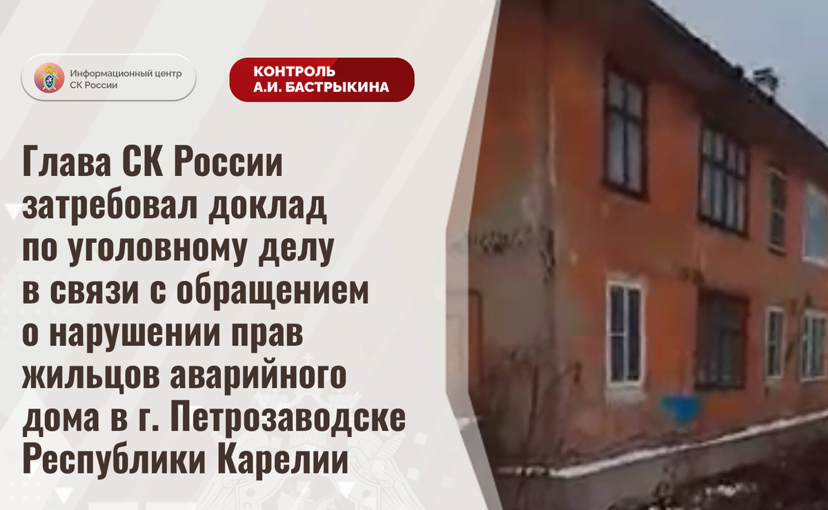 Глава СК России затребовал доклад по уголовному делу в связи с обращением о нарушении прав жильцов аварийного дома в г. Петрозаводске Республики Карелии В Информационный центр СК России поступило обращение по вопросу длительного нерасселения жильцов дома на улице Пробной в городе Петрозаводске. Двухэтажное здание 1959 года постройки находится в непригодном для проживания состоянии из-за разрушающихся конструкций и кровли. В 2017 году строение признано аварийным, однако до настоящего времени мер к предоставлению гражданам благоустроенного жилья не принимается, сроки расселения перенесены на 2027 год. Обращения жильцов в различные инстанции результатов не принесли. В СУ СК России по Республике Карелии возбуждено уголовное дело. Председатель Следственного комитета Российской Федерации Александр Иванович Бастрыкин затребовал у руководителя СУ СК России по Республике Карелии Максима Сергеевича Козлова доклад о ходе и результатах расследования уголовного дела. Исполнение поручения поставлено