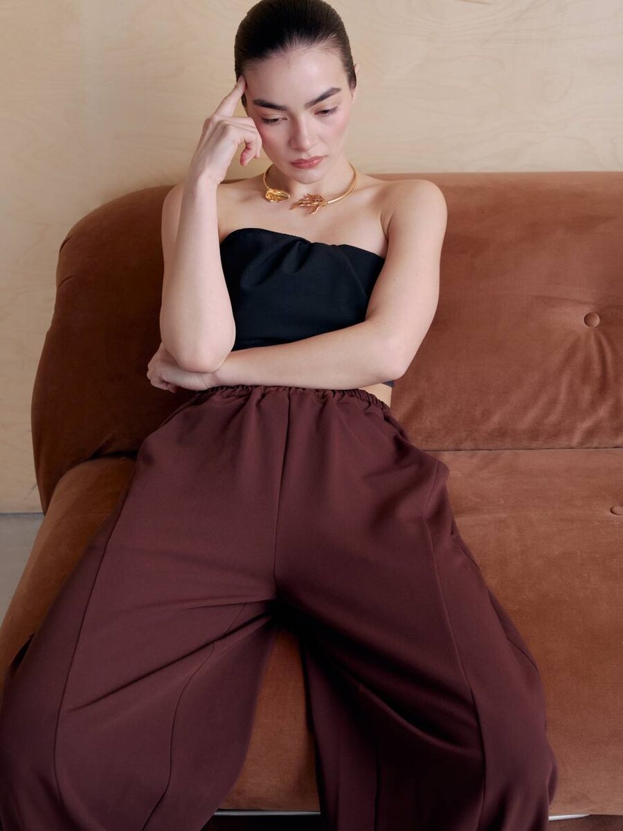 сегодня главный герой – брюки Шайн цвета горького шоколада 📼 добавили к ним чёрную косынку вместо топа из этого сета, золотой чокер и бархатные тапочки как вам?