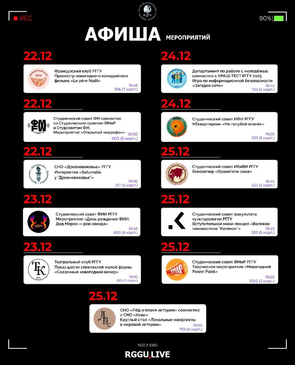 📢 Французский клуб РГГУ зовёт на просмотр новогоднего комедийного фильма «Le père Noël» 📌 22.12/ 18:45/ 396 (7 корп.) Подробнее здесь 👈 📢 Студенческий совет ФМ совместно со Студенческим советом ФМиР и Студсоветом ФЖ готовят мероприятие «Открытый микрофон» 📌 22.12/ 19:00/ 603 (6 корп.) Подробнее здесь 👈 📢 СНО «Древневековье» РГГУ приглашает на интерактив «Saturnalia у "Древневековья"» 📌 22.12/ 19:00/ 317 (6 корп.) Подробнее здесь 👈 📢 Студенческий совет ФИИ РГГУ ждёт на мероприятии «День рождения ФИИ: Дед Мороз — рок-звезда» 📌 23.12/ 18:45/ 600 (6 корп.) Подробнее здесь 👈 📢 Театральный клуб РГГУ устраивает показ шести спектаклей малой формы «Сказочный новогодний вечер» 📌 23.12/ 19:00/ 390 (7 корп.) Подробнее здесь 👈 📢 Департамент по работе с молодёжью совместно с КРАШ-ТЕСТ РГГУ 2025 организуют игру по информационной безопасности «Загадки сети» 📌 24.12/ 18:45/ 733 (5 корп.) Подробнее здесь 👈 📢 Студенческий совет ИФИ РГГУ собирает НЕквартирник «Не голубой огонёк» �