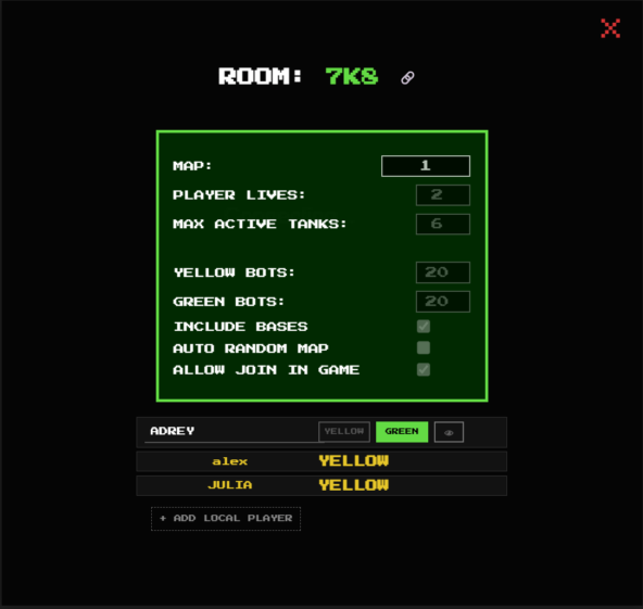 Помните те времена? Вы сидите на полу перед пузатым телевизором. Друг орет: "Оставь звезду мне, я прокачаюсь!". Вы случайно (или специально?) стреляете в его танк, он в ответ пробивает базу, и под звук «Тыдыщ!» и надпись GAME OVER. Battle City (или просто Tank 1990) — это не просто игра. Это наше общее детство. Мы выросли, друзья разъехались, джойстики потерялись. Но мне безумно захотелось вернуть этот азарт. Не возиться с эмуляторами и настройкой сети, а просто кинуть ссылку в чат и через секунду уже орать в Дискорде: "Прикрой правый фланг, там бронированный едет!". Так появились этот проект. Кооператив — это классика. Но мы пошли дальше. Что будет, если вместо глупых ботов против вас выедут реальные люди? Мы сделали полноценный PvP режим. Желтые против Зеленых. Можно собрать лобби всех друзей и устроить замес 6 на 6. Или просто добавить в комнату кучу сложных ботов и попробовать выжить вдвоем, как в старые добрые. Главная цель была одна — сохранить оригинальную физику. Управление: Т