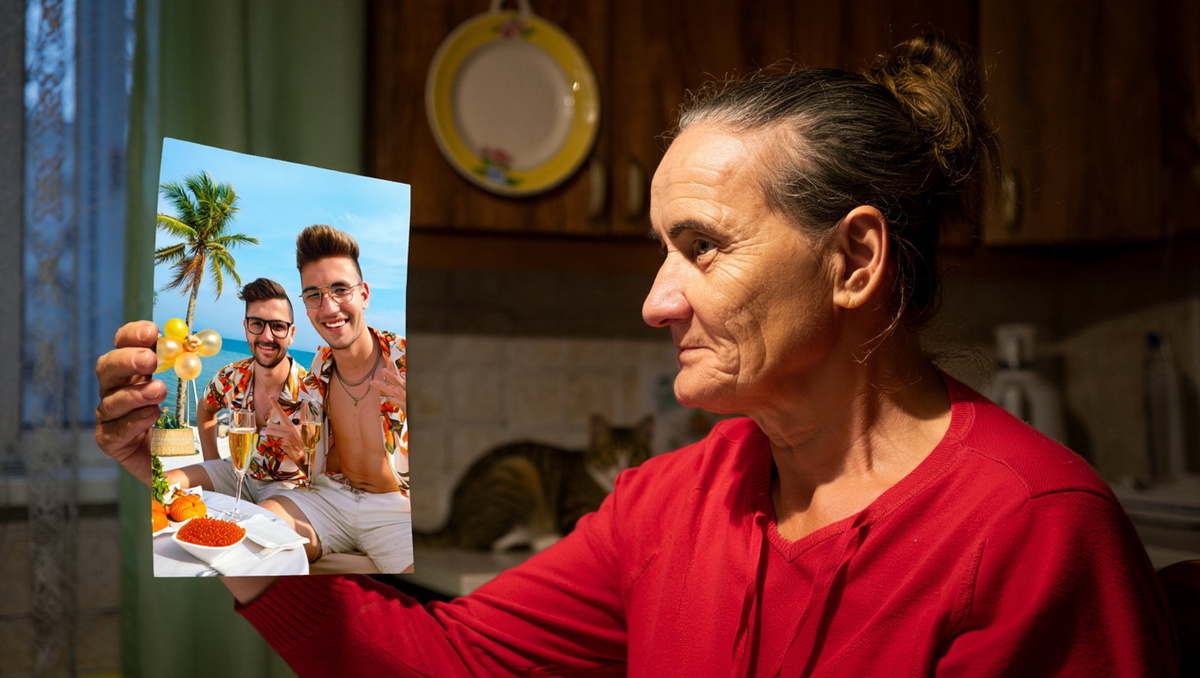 Люда приблизила фото. На столе — икра, красная рыба, запечённое мясо. У Дениса в руках новый айфон. У Кирилла на запястье дорогие часы.