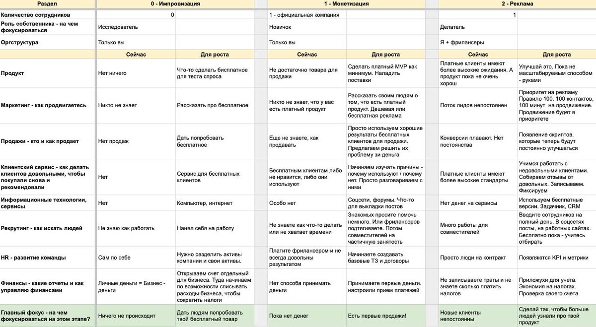 Нужно четко понимать 2 вещи: 1️⃣ На каком этапе развития бизнеса вы находитесь 2️⃣ В какой части вашего бизнеса прямо сейчас у вас «узкое горлышко» - место, которое не дает расти. Расписываю сейчас 10 этапов развития бизнеса по 12-ти составным частям бизнеса Составные части: 1 Количество сотрудников 2 Роль собственника - на чем фокусироваться 3 Оргструктура 4 Продукт 5 Маркетинг - как продвигаетесь 6 Продажи - кто и как продает 7 Клиентский сервис - как делать клиентов довольными, чтобы покупали снова и рекомендовали 8 Информационные технологии, сервисы 9 Рекрутинг - как искать людей 10 HR - развитие команды 11 Финансы - какие отчеты и как управляю финансами 12 Главный фокус - на чем фокусироваться на этом этапе? 10 этапов развития бизнеса: 1 Поиск модели 2 Монетизация 3 Реклама 4 Стабилизация 5 Приоритизация 6 Продуктивность 7 Оптимизация 8 Категоризация 9 Специализация 10 Капитализация Расписываем так, чтобы было легко определить - на каком этапе находится какой элемент в биз