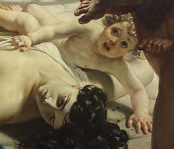 А рядом по памяти набросал на листе бумаги одну из центральных групп полотна — двух мужчин, несущих старца отца. Можно вспомнить, что в своей статье Гоголь заострил внимание совсем на другой центральной фигурной композиции: на лежащей матери с обнажённой грудью — реально узнаваемой Юлии Самойловой. Он обстоятельно и с чувством живописал тогда её дышащую негою и силою грудь, которая обещала роскошь блаженства. О страстях любвеобильного Пушкина не писал разве что очень ленивый. Но он зарисовывает совсем не женскую фигуру. А Гоголь для словесной зарисовки избирает красивую женщину. Психология творчества всё же забавные этюды порой предлагает. Картина одна и та же. Однако каждый считывает с неё разное и воспринимает её по-разному.