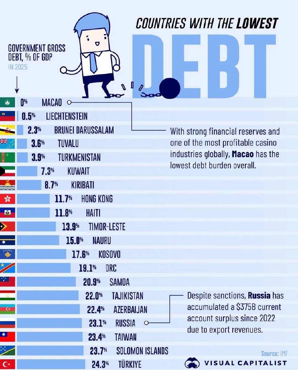 ΠΠ° ΠΈΠ½ΡΠΎΠ³ΡΠ°ΡΠΈΠΊΠ΅ ΡΡΡΠ°Π½Ρ Ρ ΡΠ°ΠΌΡΠΌ Π½ΠΈΠ·ΠΊΠΈΠΌ Π΄ΠΎΠ»Π³ΠΎΠΌ ΠΊ ΠΠΠ Π² 2025 Π³ΠΎΠ΄Ρ. Π¦ΠΈΡΡΡ ΠΊΡΠ°ΡΠΈΠ²ΡΠ΅, Π½ΠΎ ΡΡΡ Π²Π°ΠΆΠ½ΠΎ Π½Π΅ Π²Π΅ΡΡΠΈΡΡ Π½Π° ΠΈΠ»Π»ΡΠ·ΠΈΡ. ΠΠΎΠ»Ρ ΠΏΡΠΎΡΠ΅Π½ΡΠΎΠ² Ρ ΠΠ°ΠΊΠ°ΠΎ - Π·Π²ΡΡΠΈΡ ΠΊΡΡΡΠΎ, ΠΏΠΎΠΊΠ° Π½Π΅ Π²ΡΠΏΠΎΠΌΠ½ΠΈΡΡ, ΡΡΠΎ ΡΡΠΎ ΠΌΠ°Π»Π΅Π½ΡΠΊΠ°Ρ ΡΠΊΠΎΠ½ΠΎΠΌΠΈΠΊΠ°, Π·Π°Π²ΡΠ·Π°Π½Π½Π°Ρ Π½Π° ΠΊΠ°Π·ΠΈΠ½ΠΎ ΠΈ ΡΡΡΠΈΠ·ΠΌ. Π’ΠΎ ΠΆΠ΅ ΡΠ°ΠΌΠΎΠ΅ Ρ ΠΌΠΈΠΊΡΠΎΠ³ΠΎΡΡΠ΄Π°ΡΡΡΠ²Π°ΠΌΠΈ ΠΈ ΠΎΡΡΡΠΎΠ²Π°ΠΌΠΈ: Π½ΠΈΠ·ΠΊΠΈΠΉ Π΄ΠΎΠ»Π³ ΡΠ°ΡΡΠΎ Π½Π΅ ΡΠ΅Π·ΡΠ»ΡΡΠ°Ρ Π³Π΅Π½ΠΈΠ°Π»ΡΠ½ΠΎΠ³ΠΎ ΡΠΏΡΠ°Π²Π»Π΅Π½ΠΈΡ, Π° ΠΏΡΠΎΡΡΠΎ ΠΌΠ°ΡΡΡΠ°Π±Ρ ΡΠ°ΠΊΠΈΠ΅, ΡΡΠΎ Π·Π°Π½ΠΈΠΌΠ°ΡΡ ΠΎΡΠΎΠ±ΠΎ Π½Π΅Π³Π΄Π΅ ΠΈ Π½Π΅Π·Π°ΡΠ΅ΠΌ. Π ΠΎΡΡΠΈΡ - ΠΎΠΊΠΎΠ»ΠΎ 23% ΠΠΠ. ΠΡΠΎ Π΄Π΅ΠΉΡΡΠ²ΠΈΡΠ΅Π»ΡΠ½ΠΎ Π½ΠΈΠ·ΠΊΠΎ ΠΏΠΎ ΠΌΠΈΡΠΎΠ²ΡΠΌ ΠΌΠ΅ΡΠΊΠ°ΠΌ. ΠΠΎ Π½ΠΈΠ·ΠΊΠΈΠΉ Π΄ΠΎΠ»Π³ ΡΠ°ΠΌ ΠΏΠΎ ΡΠ΅Π±Π΅ Π½Π΅ ΠΎΠ·Π½Π°ΡΠ°Π΅Ρ ΡΠΎΡΡ Π΄ΠΎΡ