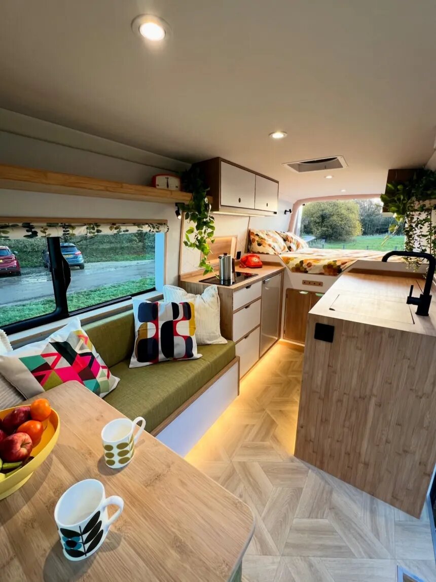 Как уже упоминалось, клиент запросил ретро-эстетику и максимальную эффективность использования пространства. Vanpuravida реализовала это, превратив компактный интерьер в очаровательное жилое пространство с теплой цветовой палитрой, сочетающей кремовые, коричневые и зеленые тона. Плюс дополненной геометрическими узорами и ретро-текстилем, тонко отсылающим к концу 1960-х годов. Теплый бамбук и рассеянное светодиодное освещение еще больше усиливают теплоту и уют пространства, превращая фургон в тихий уголок на колесах.