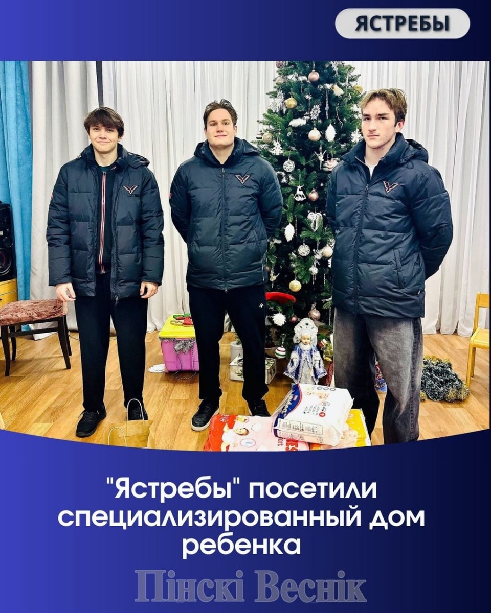 ✔️Хоккеисты «Ястребов» Арсений Палто, Роман Ботян и Ярослав Березовский вместе с пресс-атташе Кристиной Вербицкой навестили воспитанников специализированного дома ребёнка. ➡️Они привезли подарки, собранные болельщиками на одном из домашних матчей в рамках благотворительной акции. Малыши и персонал тепло встретили гостей и пожелали хоккеистам побед в сезоне. 🔵«Ястребы» доказывают: спорт — это не только борьба на льду, но и сила добра. @Пинский Вестник 📱Ютуб 📱ВК 📱ИНСТАГРАМ 📱ОК 📱ФЕЙСБУК 📱ТИК ТОК Прислать новость